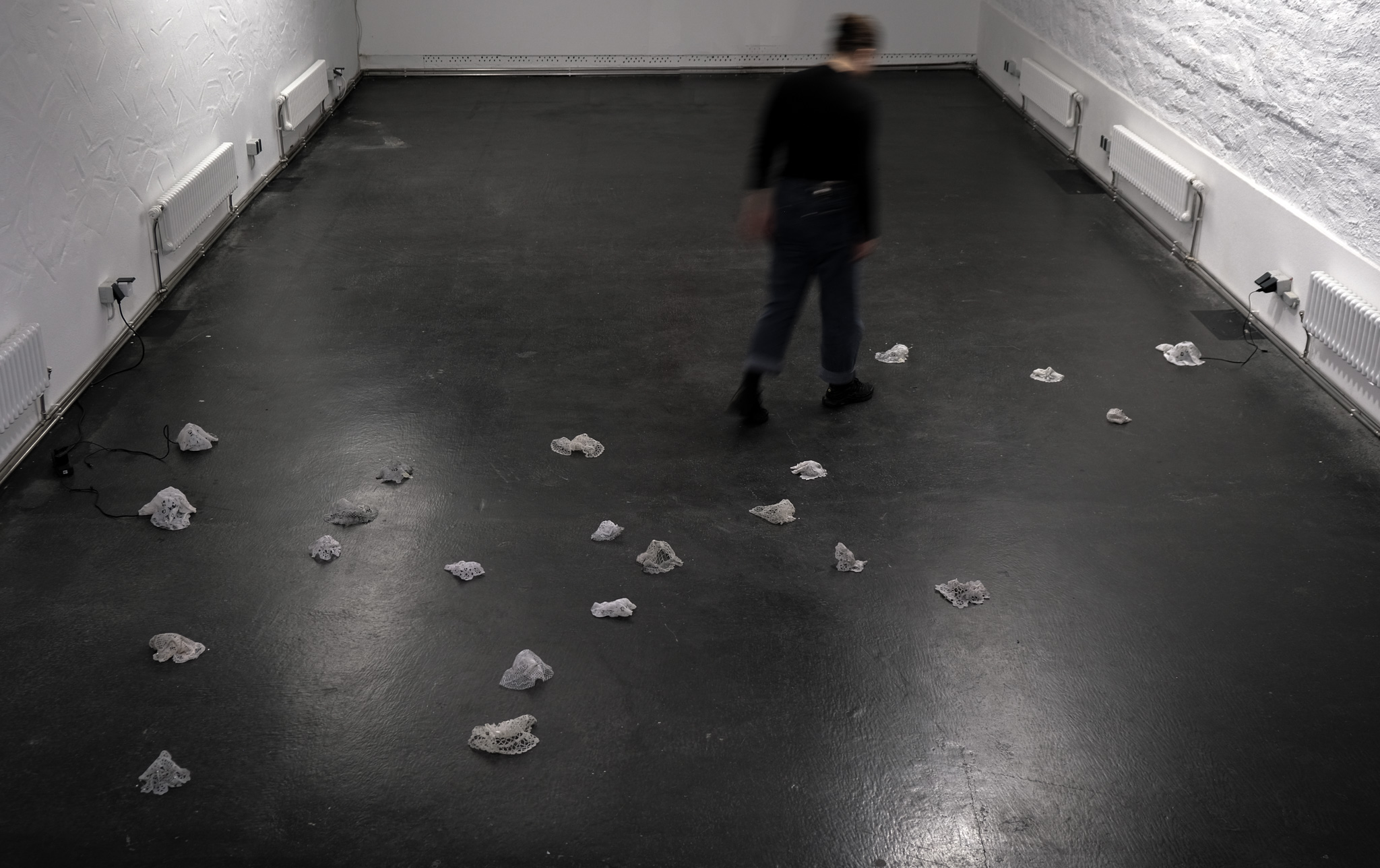 Bobbin lace doilies were hardened with resin to create individual shapes. Loudspeakers are installed under three objects, from which different sounds come, superimposed on each other. These are, firstly, whip lashes, which have the same rhythm as a second beat and are thus reminiscent of the ticking of a clock, secondly, the cutting of the air of the whip and thirdly, isolated, somewhat distorted whip lashes. Some of the objects were pinned into the floor with very long pins. The pins refer to the method of making lace, in which the unfinished lace coverlet is pinned to the lace bag so that the pattern underneath does not slip, the threads remain in their knotted form and the lace maker is given guidance as to where he/she is at any given moment.